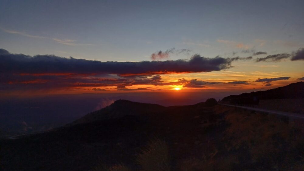 Il momento più intenso è  quando il sole scende dietro l’orizzonte e il cielo si è accende di rosso, mentre il vulcano resta lì, immenso, silenzioso ma vivo. Guardando verso valle, le luci dei paesi iniziano a brillare, quasi come un tappeto di stelle sotto i nostri piedi, mentre sopra di noi il cielo diventa sempre più scuro.